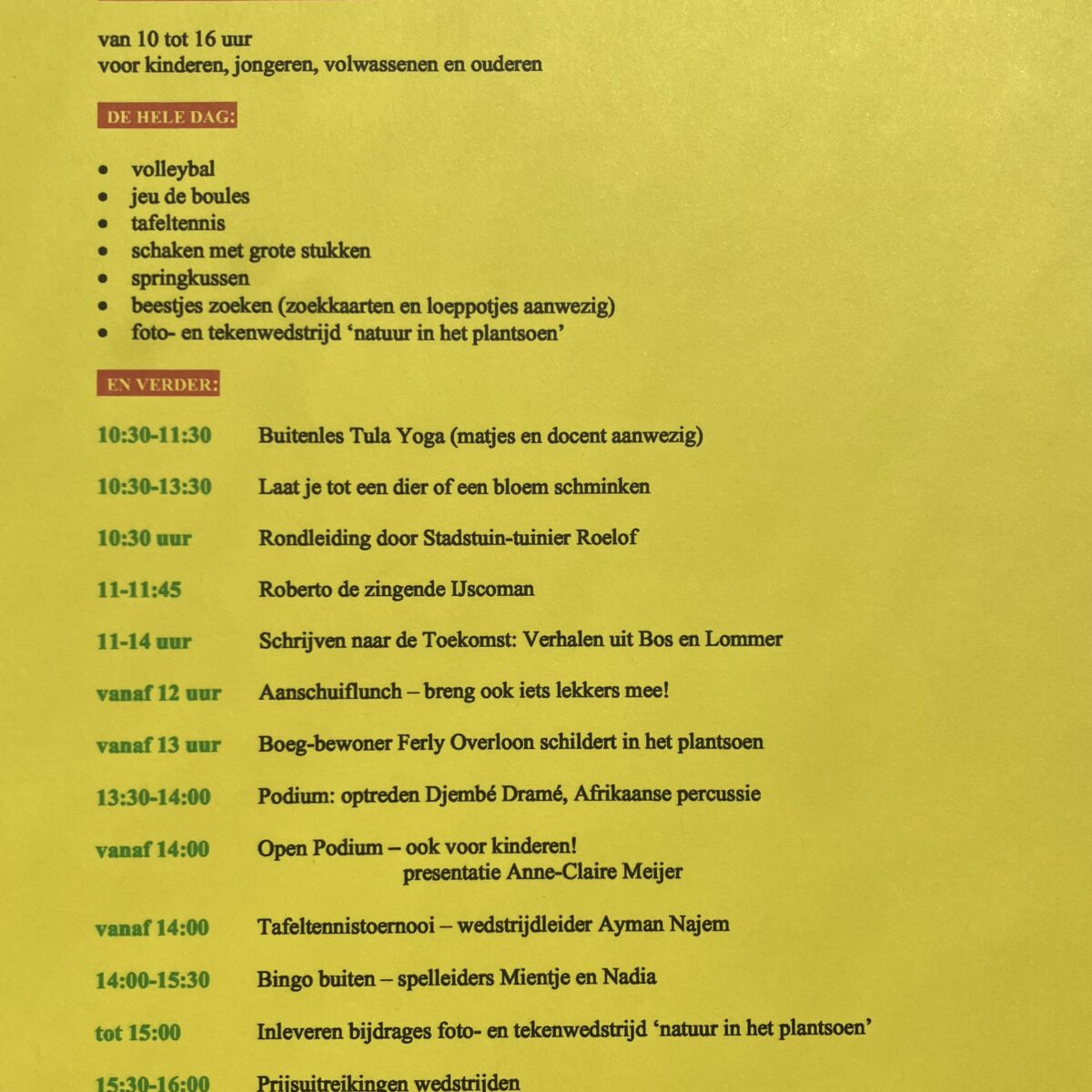 Op zaterdag 10 juni is het zover: we vieren het 10-jarig bestaan van ons plantsoen, met veel natuur, nog meer sport & spel, met een feestdis vol lekkere hapjes en drankjes, een optreden van Djémbé Dramé uit Bos en Lommer en een Open Podium voor iedereen die met muziek, zang, dans, cabaret, verhalen en acts de feestvreugde wil verhogen. Kom ook, doe mee, want het is een feest voor en door de hele buurt.