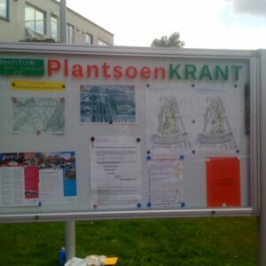 De oude PlantsoenKRANT, die Stadstuin Bos en Lommer in 2010 heeft geplaatst, is vervangen. De poten waren stuk. Gebiedsmakelaar Chantal Buitenhuis tikte een tweedehands exemplaar op de kop. Inmiddels is daarvan ook de beschadigde glasplaat met de kapotte slotjes vervangen. En nu…? …nu wachten we al maanden op de sleuteltjes.